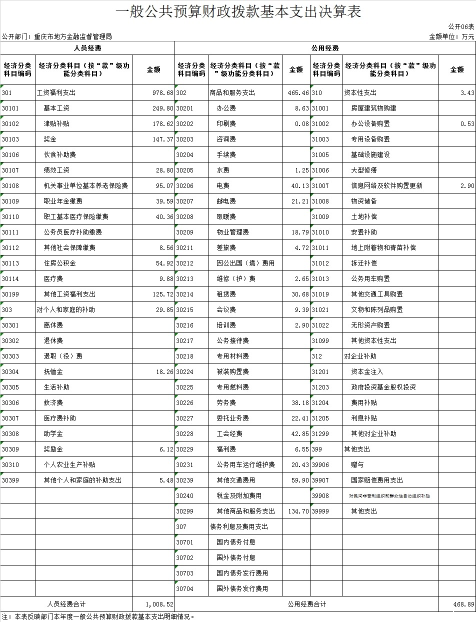 本部门2018年度一般公共财政拨款基本支出1,477.42万元。其中:人员经费1,008.52万元,较上年决算数增加151.02万元,增长17.61%,主要原因是增加基本工资、退休补助及死亡抚恤金等一次性经费。人员经费用途主要包括基本工资、津贴补贴、奖金、社会保障缴费、绩效工资、医疗费、住房公积金等。公用经费468.89万元,较上年决算数增加253.23万元,增长117.42%,主要原因是增加P2P网络借贷整治办公室等临时机构、购置公务用车等,致使机关运行成本增加。公用经费用途主要包括办公费、水电物管费、维修(护)费、租赁费、培训费、工会费、福利费、劳务费、公务用车运行维护费等。