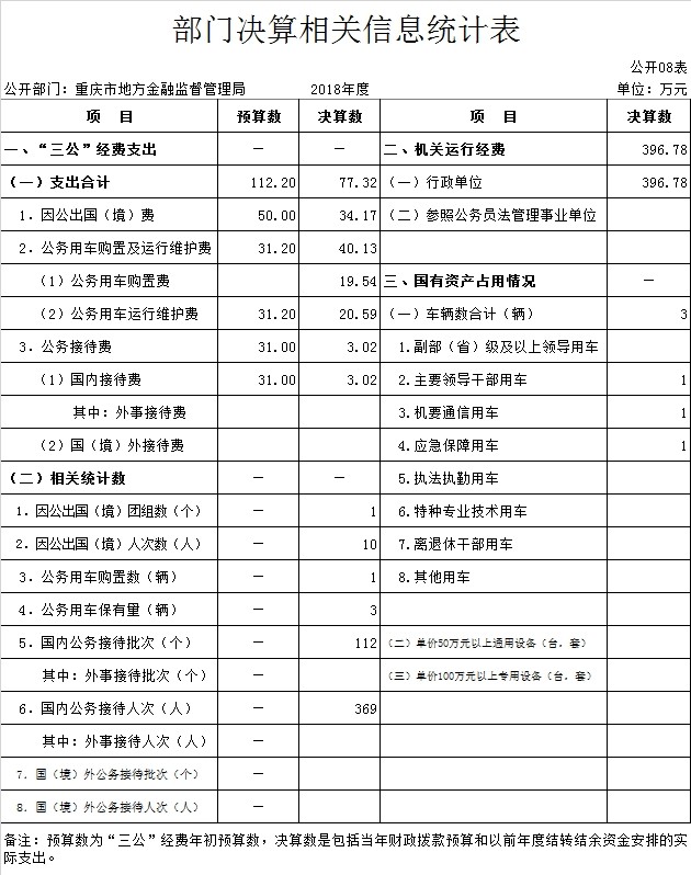 (一)机关运行经费情况说明。2018年度本部门机关运行经费支出396.78万元,机关运行经费主要用于开支办公费、水电物管费、维修(护)费、租赁费、公务车运行维护费、培训费等。机关运行经费较上年决算数增加251.62万元,增长173.34%,主要原因:一是经批准本年度新增P2P网络借贷整治办公室等临时机构及人员,导致机关运行成本上升;二是按照部门决算列报口径调整经济科目,减少人员经费,增加公用经费。