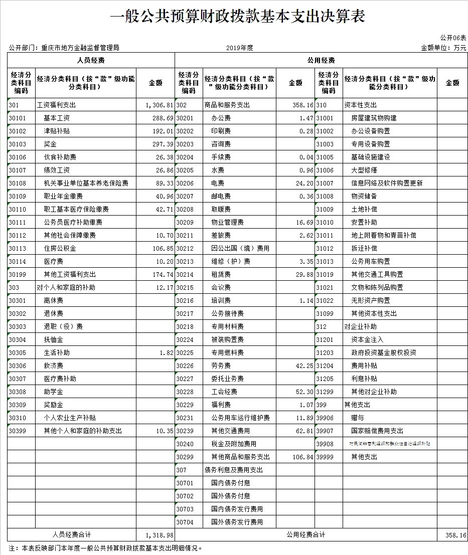 2019年度一般公共财政拨款基本支出1,677.14万元。其中:人员经费1,318.98万元,较上年决算数增加310.46万元,增长30.78%,主要原因:一是机构改革新进人员增加工资及社保缴费等;二是工资性支出政策性增长。人员经费用途主要包括基本工资、津贴补贴、奖金、社会保障缴费、住房公积金、医疗费等。公用经费358.16万元,较上年决算数减少110.73万元,下降23.62%,主要原因是坚持厉行节约,有效控制办公费、公务车运行维护费等。公用经费用途主要包括办公费、印刷费、水电物管费、维修(护)费、劳务费、公务车运行维护费等。