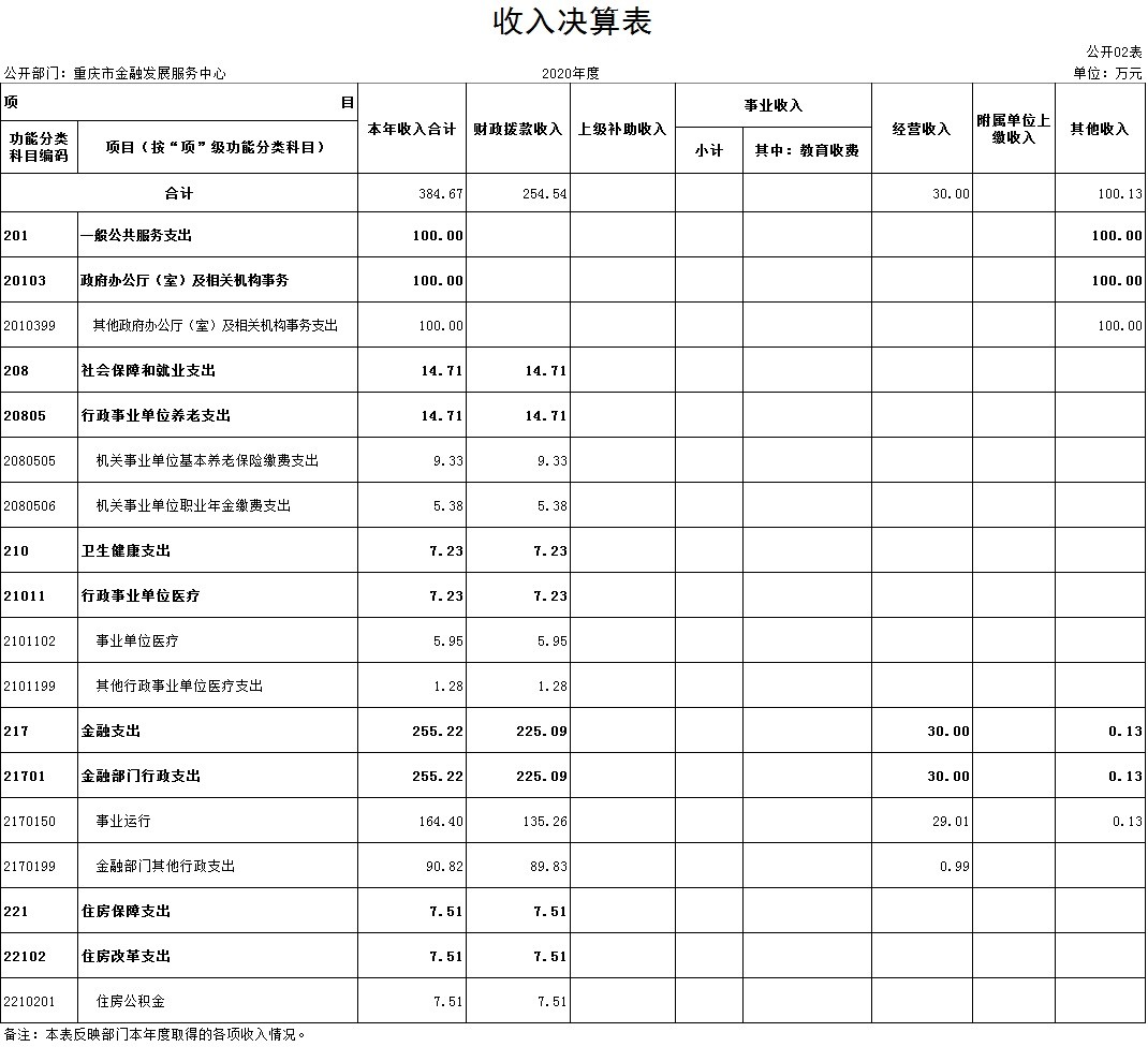 2.收入情况。2020年本年收入合计384.67万元,较上年决算数增加33.86万元,增长9.7%,主要原因是从2020年起,金融领域纳入全市英才计划,人才专项开发经费收入增加。其中:财政拨款收入 254.54万元,占66.2%;经营收入 30.00万元,占7.8%;其他收入 100.13万元,占26%。此外,使用非财政拨款结余 3.68万元,年初结转和结余22.50万元。