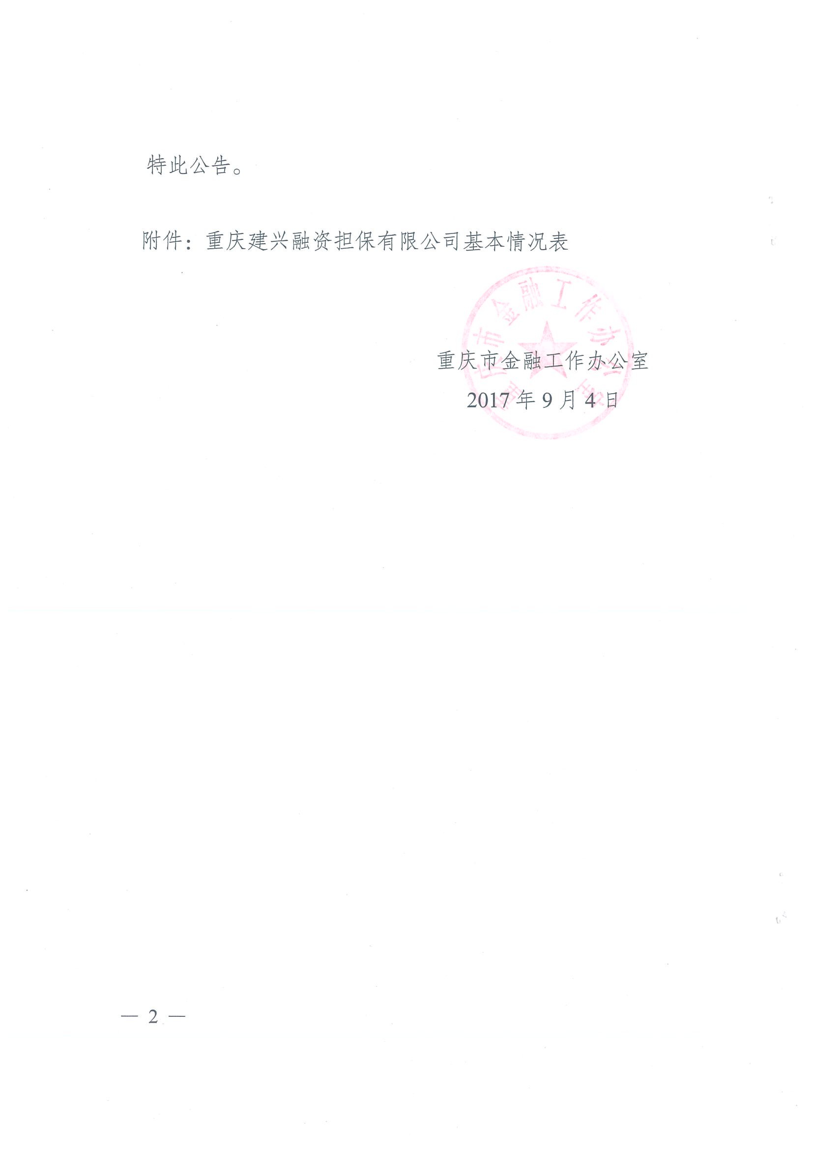 关于重庆建兴融资担保有限公司融资担保机构经营许可证有效期到期的公告
